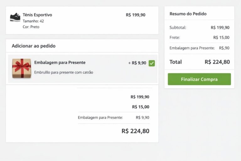 Exemplos incluem personalização, garantia estendida e embalagem para presente.
