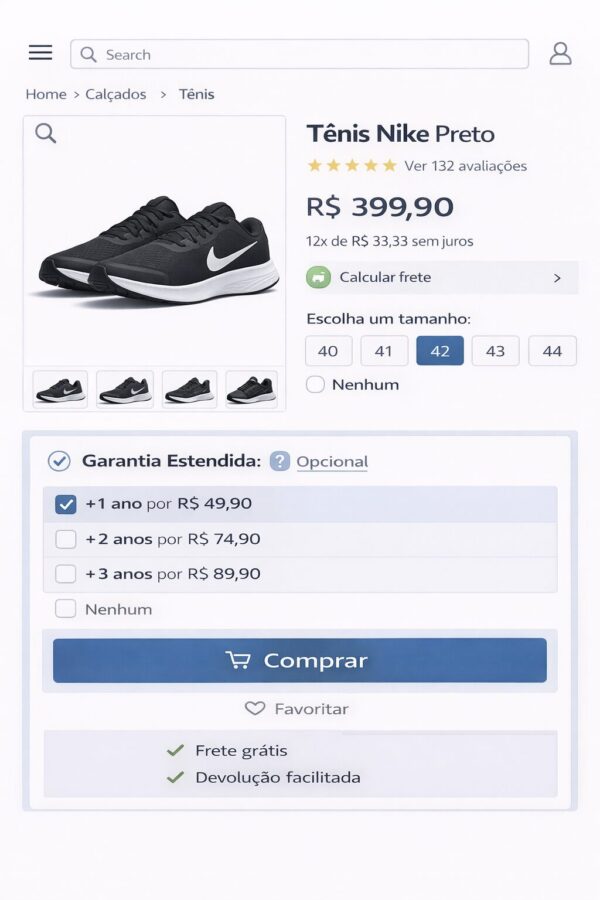 👉 “Adicionar garantia estendida”, com diferentes planos disponíveis.